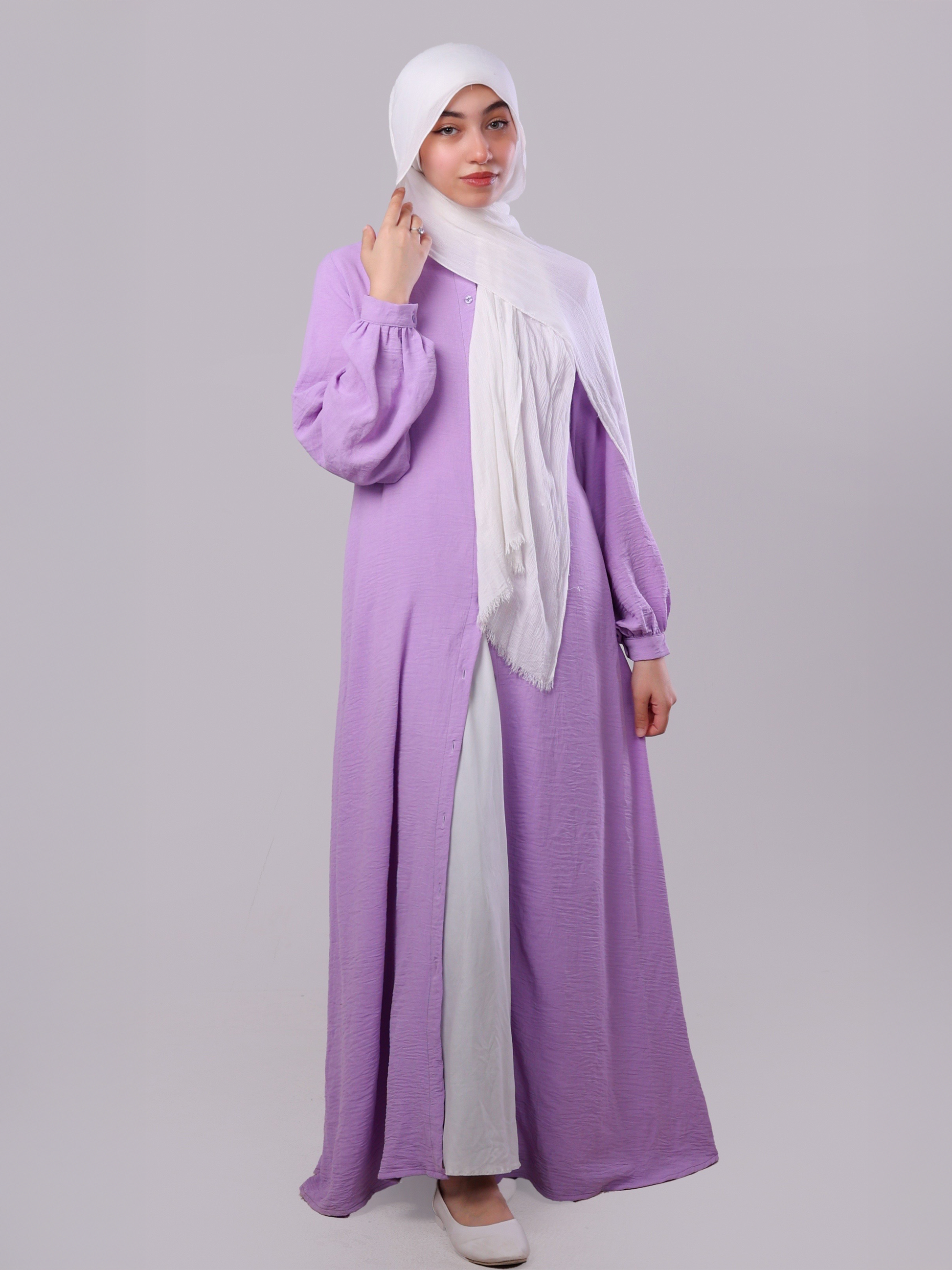 الخامة مريحة، غير شفافة، وانسيابية عشان تديكي ثقة كاملة في كل حركة، وكمان مناسبة لأجواء الخريف والربيع 🌿🍂.